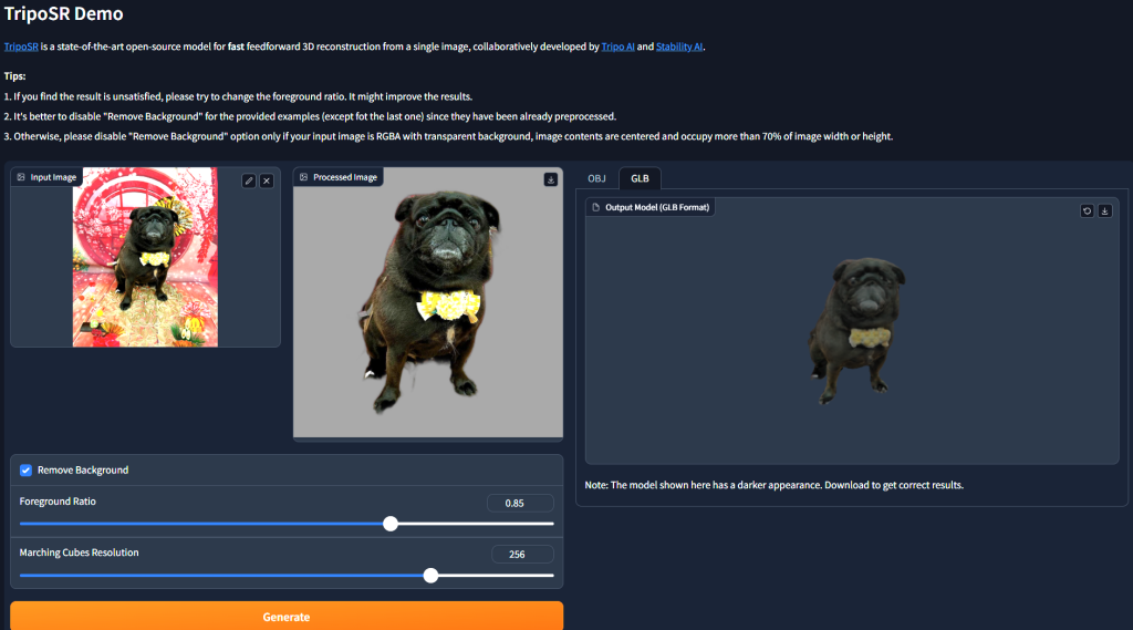 - 出力形式: OBJ (色なし), GLB (色付き)。